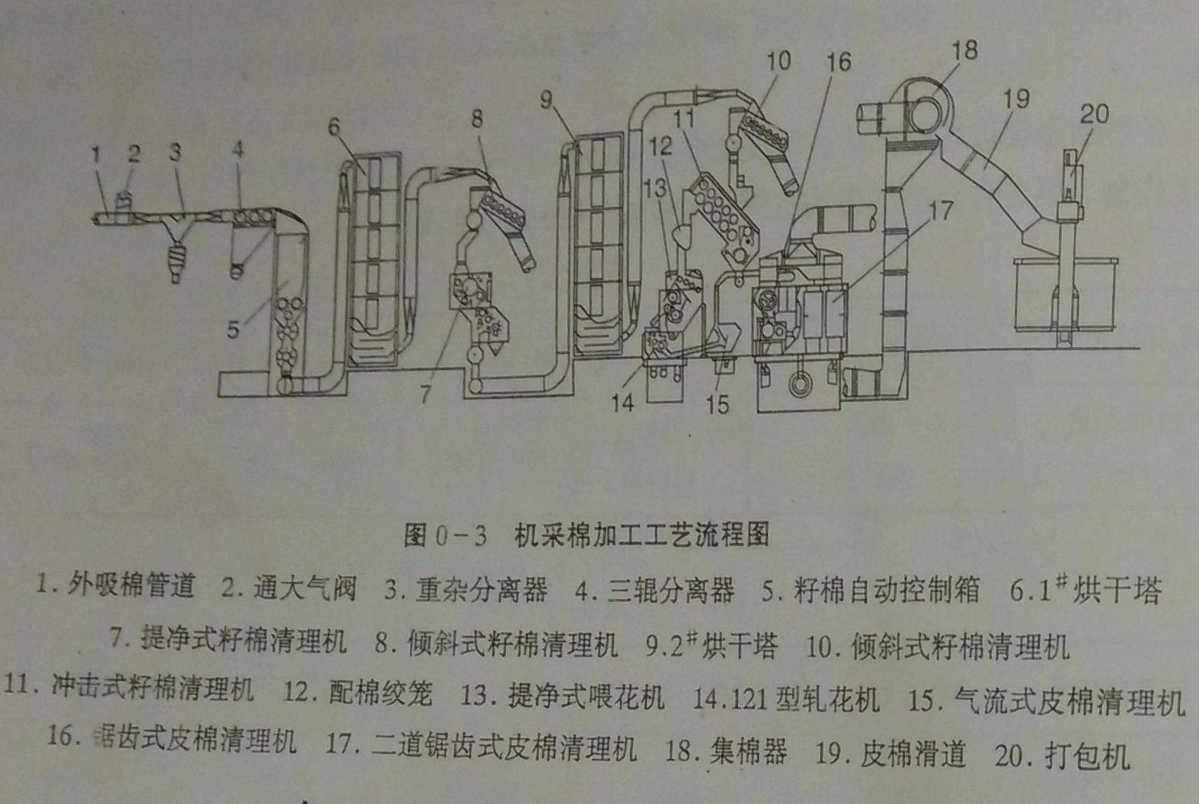 由于机采棉中的外附杂质较手摘棉高出几倍,籽棉含水又较高,故轧花前的籽棉需经过多次清理和1-2次的烘干,轧花后的皮棉需经过2次或更多次的清理。图0-3天鹅棉机工艺图,相对于手摘棉的MY121棉花加工新工艺而言,该工艺增加了籽棉烘干次数,增加了籽棉清理次数(其中,在第一次籽棉烘干之后增加了用于清除棉铃、铃壳、棉枝等杂质的提净式籽棉清理机,并在第一、第二次籽棉烘干之后均采用了兼有将棉分离作用的倾斜式籽棉清理机。),增加了皮棉清理次数(采用一次气流式皮棉清理和二次锯齿滚筒式皮棉清理)。图0-4邯郸棉机工艺图,相对于手摘棉的9588机电一体化棉花加工新工艺而言,该工艺增加了籽棉烘干次数,增加了籽棉清理次数(其中,在第一次籽棉烘干之后增加了用于清除籽棉中的棉铃、铃壳等重杂质的清铃机和用于清除棉叶、不孕籽、尘杂等细小杂质的回收式籽棉清理机,在第二次籽棉烘干之后采用了兼有籽棉分离作用的倾斜式籽棉清理机和回收式籽棉清理机。),增加了皮棉清理次数(采用一次气流式皮棉清理和二次锯齿滚筒式皮棉清理)。