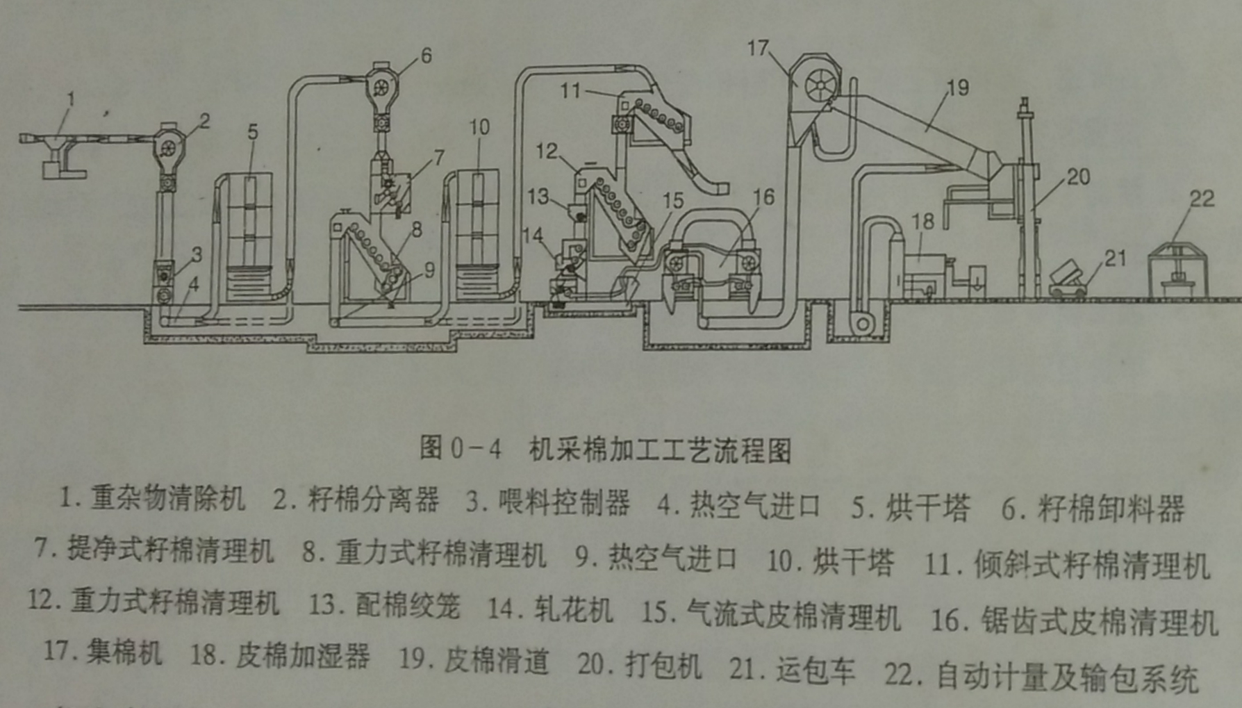 由于机采棉中的外附杂质较手摘棉高出几倍,籽棉含水又较高,故轧花前的籽棉需经过多次清理和1-2次的烘干,轧花后的皮棉需经过2次或更多次的清理。图0-3天鹅棉机工艺图,相对于手摘棉的MY121棉花加工新工艺而言,该工艺增加了籽棉烘干次数,增加了籽棉清理次数(其中,在第一次籽棉烘干之后增加了用于清除棉铃、铃壳、棉枝等杂质的提净式籽棉清理机,并在第一、第二次籽棉烘干之后均采用了兼有将棉分离作用的倾斜式籽棉清理机。),增加了皮棉清理次数(采用一次气流式皮棉清理和二次锯齿滚筒式皮棉清理)。图0-4邯郸棉机工艺图,相对于手摘棉的9588机电一体化棉花加工新工艺而言,该工艺增加了籽棉烘干次数,增加了籽棉清理次数(其中,在第一次籽棉烘干之后增加了用于清除籽棉中的棉铃、铃壳等重杂质的清铃机和用于清除棉叶、不孕籽、尘杂等细小杂质的回收式籽棉清理机,在第二次籽棉烘干之后采用了兼有籽棉分离作用的倾斜式籽棉清理机和回收式籽棉清理机。),增加了皮棉清理次数(采用一次气流式皮棉清理和二次锯齿滚筒式皮棉清理)。